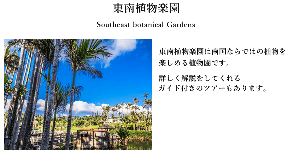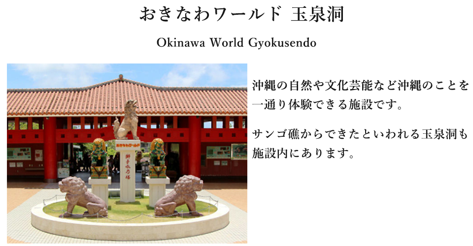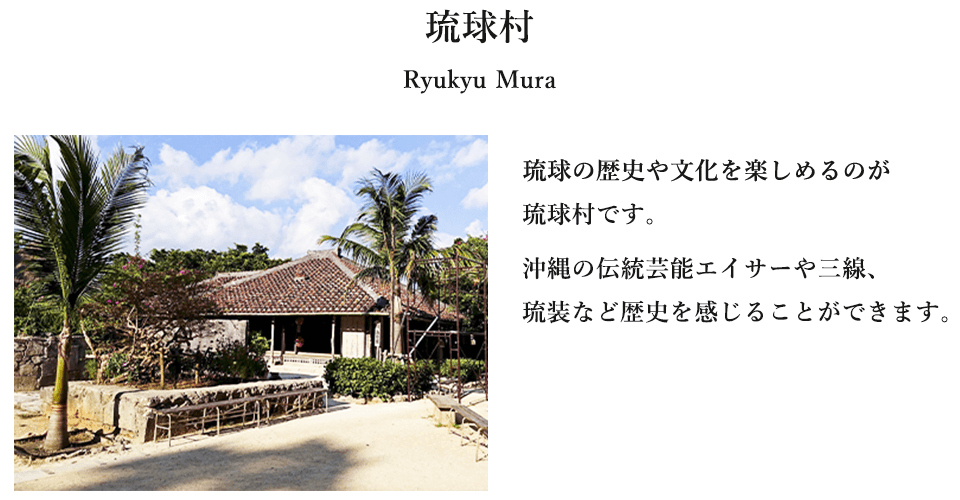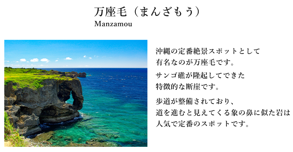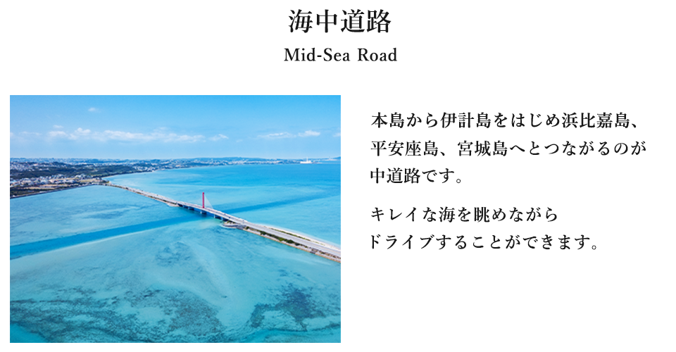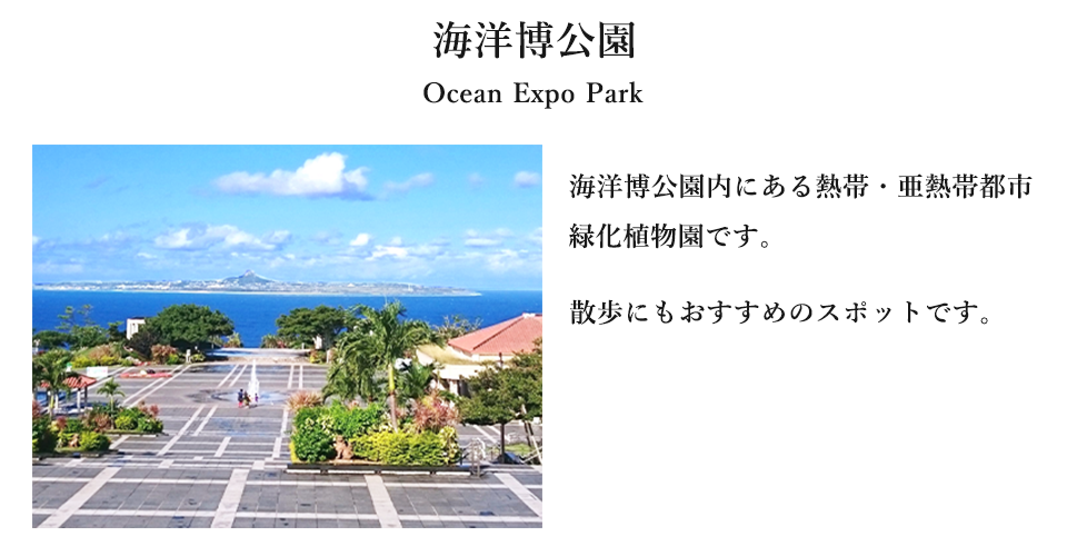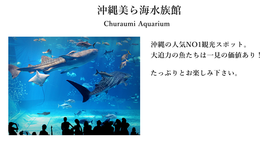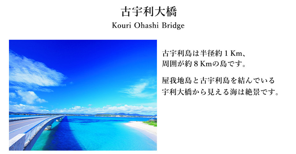 本島北部・本部町の『海洋博公園・沖縄美ら海水族館』、透明度抜群の海に囲まれた『古宇利島』まで車で約80分、お土産品店や飲食店の立ち並ぶ、本島南部・那覇市の『沖縄風景』まで車で約40分と、