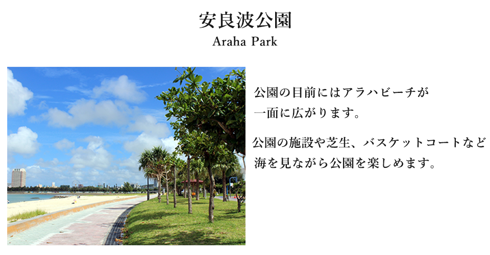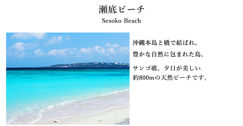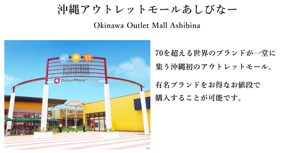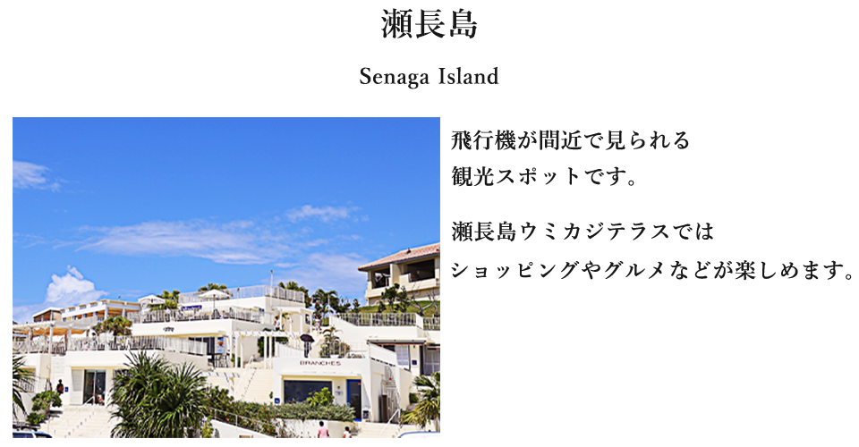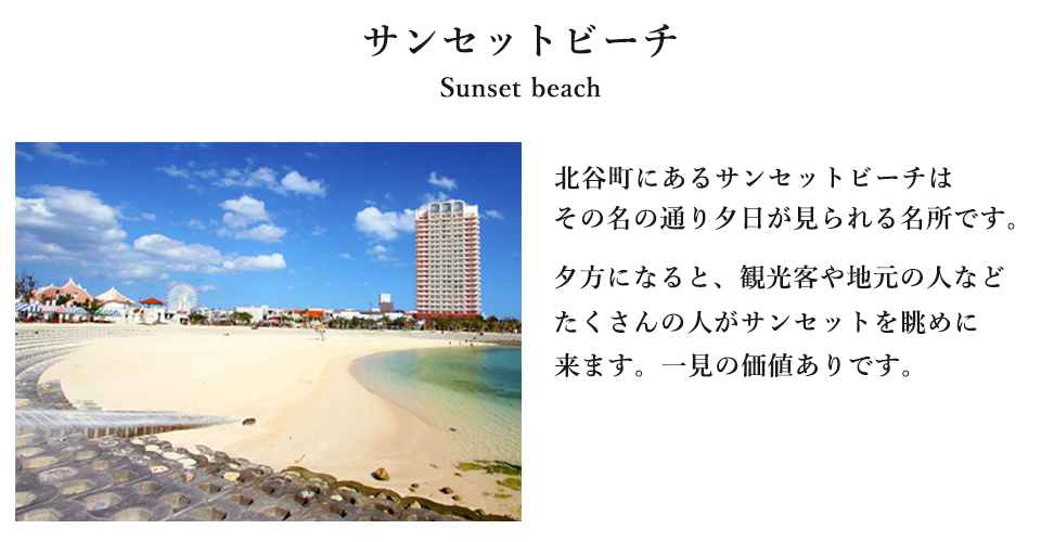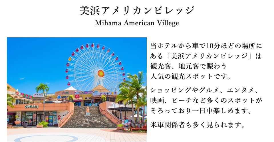 車で約10分の距離には、異国情緒漂う『アメリカンビレッジ』でショッピングやグルメを『サンセットビーチ』では県内屈指の夕陽を楽しむことができ、本島中部エリアを満喫できます。